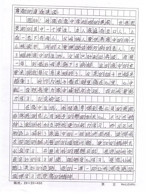 今年3月,百色中學(xué)的30多位受助學(xué)生紛紛給集團(tuán)寫來了感謝信,感謝集團(tuán)對他們的資助,讓他們能繼續(xù)安安心心的讀書,不用為因家里困難而隨時面臨輟學(xué)的事情困擾。