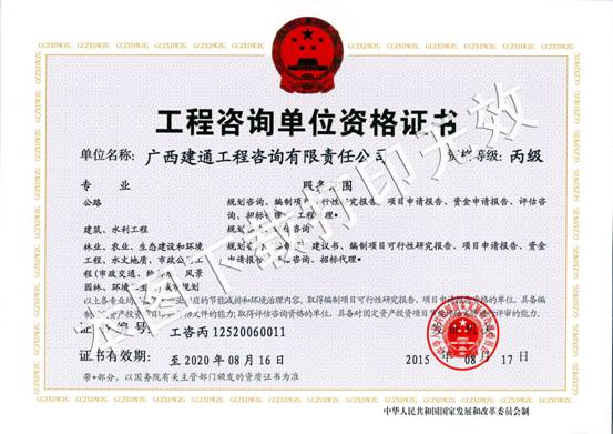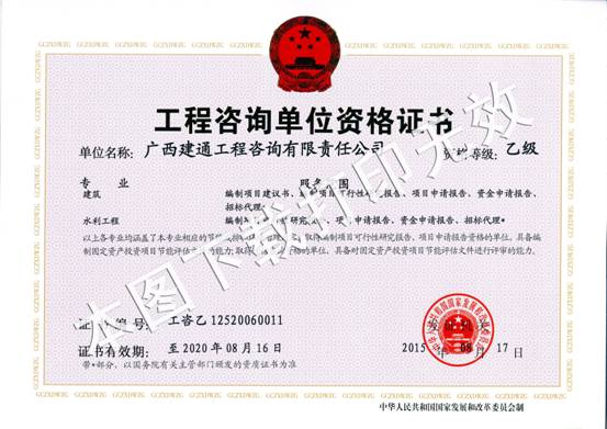 在集團(tuán)公司的正確領(lǐng)導(dǎo)下,集團(tuán)各部門同事的大力支持和協(xié)助下,品牌運(yùn)營(yíng)公司經(jīng)過(guò)多方努力,積極準(zhǔn)備,按資質(zhì)等級(jí)標(biāo)準(zhǔn)要求向廣西工程咨詢協(xié)會(huì)、中國(guó)工程咨詢協(xié)會(huì)等管理部門遞交申報(bào)材料,我集團(tuán)旗下子公司廣西建通工程咨詢有限責(zé)任公司于2015年9月14日《工程咨詢單位資格證書》成功由原來(lái)水利工程專業(yè)丙級(jí)升級(jí)到乙級(jí),目前我們?cè)擁?xiàng)資質(zhì)所具備的專業(yè)有:1.建筑(乙級(jí))、2.水利工程(乙級(jí))、3.公路(丙級(jí))、4.林業(yè)(丙級(jí))、5.農(nóng)業(yè)(丙級(jí))、6.生態(tài)建設(shè)和環(huán)境工程(丙級(jí))、7.水文地質(zhì)(丙級(jí))、8.城市規(guī)劃、9.市政交通(丙級(jí))、10.市政給排水(丙級(jí))、11. 市政風(fēng)景園林(丙級(jí))、12. 市政環(huán)境衛(wèi)生(丙級(jí));服務(wù)范圍包括:規(guī)劃咨詢、評(píng)估咨詢、編制項(xiàng)目建議書、編制項(xiàng)目可行性研究報(bào)告、項(xiàng)目申請(qǐng)報(bào)告、資金申請(qǐng)報(bào)告、招標(biāo)代理*、工程監(jiān)理*(帶*部分,以國(guó)務(wù)院有關(guān)主管部門頒發(fā)的資質(zhì)證書為準(zhǔn))。