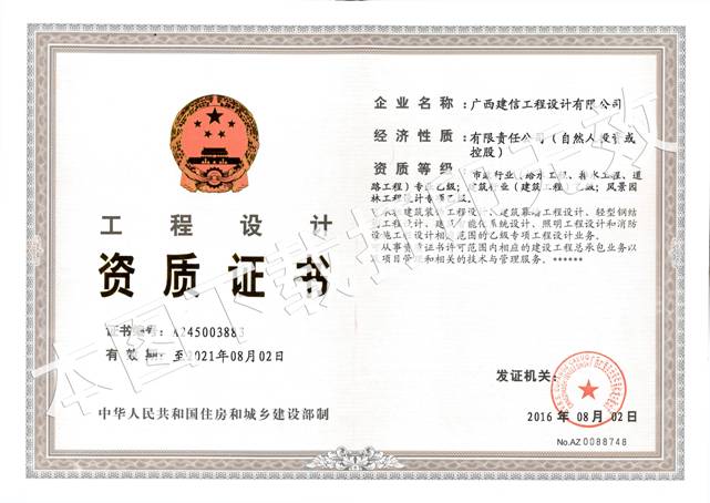 2016年08月09日,從廣西住房和城鄉(xiāng)建設(shè)廳官網(wǎng)再傳來(lái)喜訊,我集團(tuán)旗下子公司廣西建信工程設(shè)計(jì)有限公司順利通過(guò)了廣西住建廳資質(zhì)審查,成功增項(xiàng)風(fēng)景園林工程設(shè)計(jì)專項(xiàng)乙級(jí)資質(zhì)。該資質(zhì)可承攬中型以下規(guī)模風(fēng)景園林工程項(xiàng)目和投資額在2000萬(wàn)元以下的大型風(fēng)景園林工程項(xiàng)目的設(shè)計(jì)?,F(xiàn)廣西建信工程設(shè)計(jì)有限公司擁有資質(zhì)為:建筑行業(yè)(建筑工程)乙級(jí)、市政行業(yè)(給水工程、排水工程、道路工程)專業(yè)乙級(jí)、風(fēng)景園林工程設(shè)計(jì)專項(xiàng)乙級(jí)和城鄉(xiāng)規(guī)劃編制乙級(jí)。