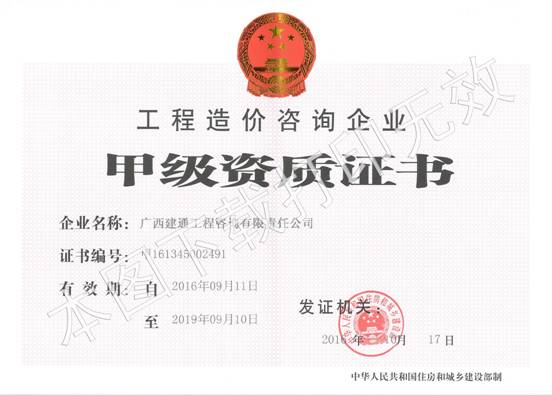 廣西建通工程咨詢有限責(zé)任公司根據(jù)《工程造價咨詢企業(yè)管理辦法》,以及《住房城鄉(xiāng)建設(shè)部辦公廳關(guān)于甲級工程造價咨詢企業(yè)資質(zhì)審核有關(guān)事項的通知》要求,工程造價咨詢企業(yè)資質(zhì)證書有效期滿后,向上級主管部門廣西住房城鄉(xiāng)建設(shè)廳、中華人民共和國住房城鄉(xiāng)建設(shè)部提交資質(zhì)延續(xù)申請材料,經(jīng)過審批后于2016年10月17日頒發(fā)新資質(zhì)證書, 證書情況如下: