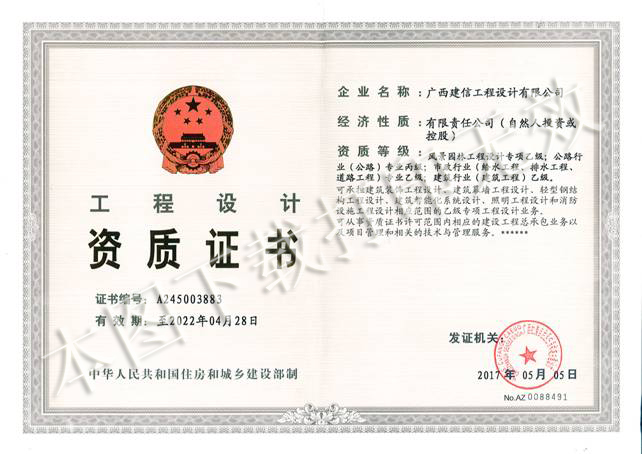 2017年05月18日,從廣西住房和城鄉(xiāng)建設(shè)廳官網(wǎng)再傳來(lái)喜訊,廣西建通投資集團(tuán)旗下子公司廣西建信工程設(shè)計(jì)有限公司順利通過(guò)了廣西住建廳資質(zhì)審查,成功增項(xiàng)公路行業(yè)(公路)專業(yè)丙級(jí)資質(zhì),有效期至2022年4月28日。該資質(zhì)可承攬三級(jí)、四級(jí)公路及其交通安全、管理、養(yǎng)護(hù)等設(shè)施設(shè)計(jì)業(yè)務(wù)。至此,廣西建通投資集團(tuán)旗下子公司廣西建信工程設(shè)計(jì)有限公司擁有了建筑行業(yè)(建筑工程)乙級(jí)、市政行業(yè)(給水工程、排水工程、道路工程)專業(yè)乙級(jí)、風(fēng)景園林工程設(shè)計(jì)專項(xiàng)乙級(jí)、城鄉(xiāng)規(guī)劃編制乙級(jí)和公路行業(yè)(公路)專業(yè)丙級(jí)等資質(zhì)。