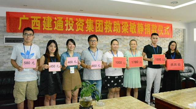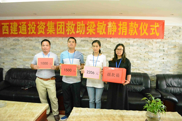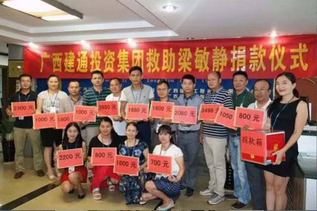 眾志成城,真情涌動。在集團董事長鄧安杰就梁敏靜身患重病作出“待崗就醫(yī)期間照常發(fā)放基本工資并增加生活津貼,仍享受集團的各項福利,集團第二秘書處全力協(xié)助配合梁敏靜家屬辦理醫(yī)療及住院手續(xù)”的指示后,集團員工發(fā)起了以“少喝一杯可樂,少抽一包香煙,少吃一個雪糕,延長一個生命,拯救一個家庭”為主要內(nèi)容的《建通大愛·傳遞正能量》募捐活動,積極為梁敏靜捐款獻愛心,短短一天時間就募捐了45740元,其中百色總部24230元,南寧總部21510元。2016年9月,集團在得知梁敏靜的醫(yī)療總費用已高達245435.72元(其中醫(yī)療保險報銷部分為196527.32元,個人支付部分從集團45740元的捐款中撥付,已超支3168.4元)時,集團再次發(fā)出捐款倡議,也是短短數(shù)日,集團上下紛紛慷慨解囊,又籌集善款59594元,再次為梁敏靜解決了燃眉之急……