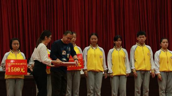 圖為集團副總裁黃承理給受助學生頒發(fā)助學金