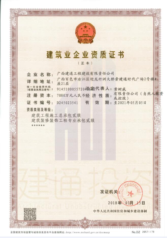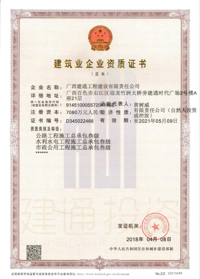 2018年04月08日,建通投資集團(tuán)旗下子公司廣西建通工程建設(shè)有限責(zé)任公司成功增項(xiàng)水利水電工程施工總承包叁級(jí)資質(zhì)并取得證書,目前建通建設(shè)公司所擁有的資質(zhì)及等級(jí)為: