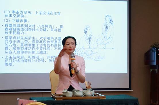 青羽老師通過引古博今的講解和生動的圖片展示,向參訓人員介紹了商務禮儀的含義、特點、原則等理論知識,主要從禮儀的概念及禮儀的意義、職業(yè)形象、高效辦公、魅力拜訪、親和接待、宴請禮儀等六個模塊進行全方面的詮釋,使參訓人員掌握了在各種商務活動中提升商務品味修養(yǎng)和魅力的技巧。
