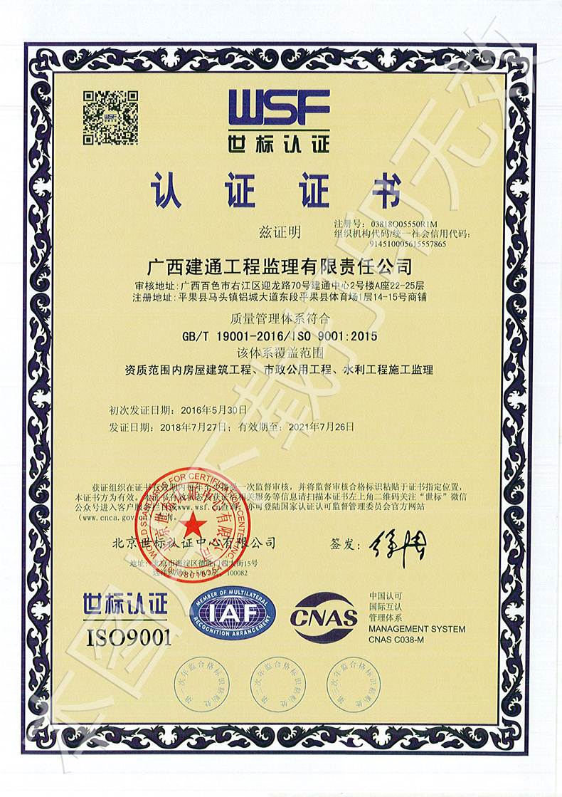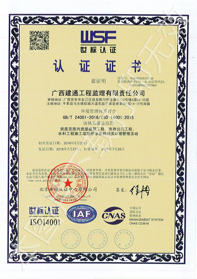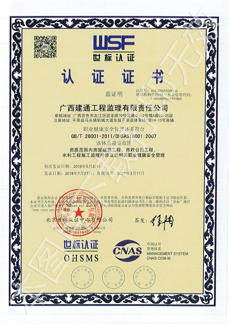 廣西建通工程監(jiān)理有限責(zé)任公司三大管理體系認(rèn)證證書