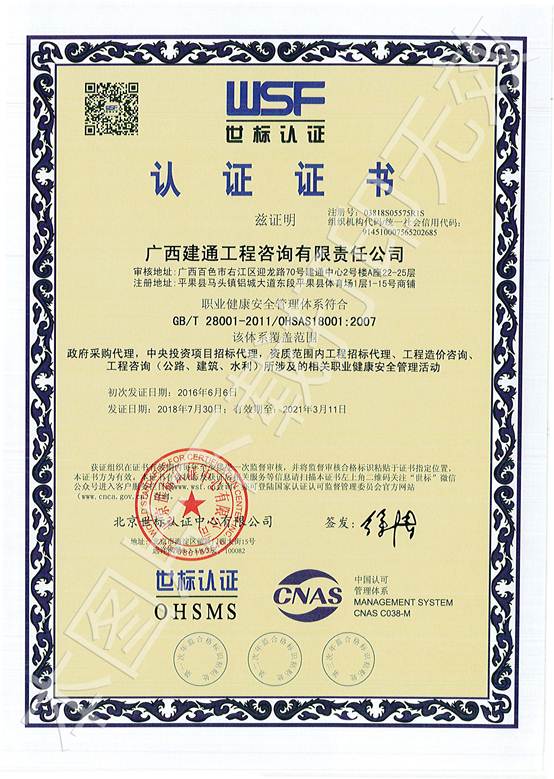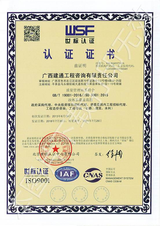 廣西建通工程咨詢有限責(zé)任公司三大管理體系認(rèn)證證書