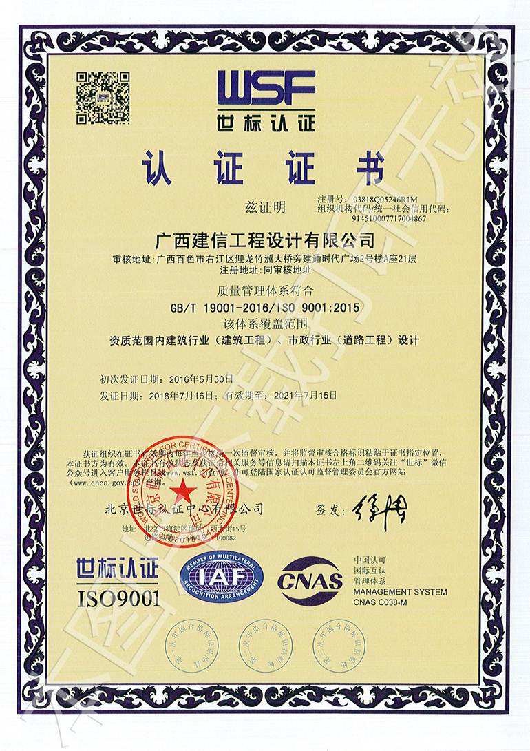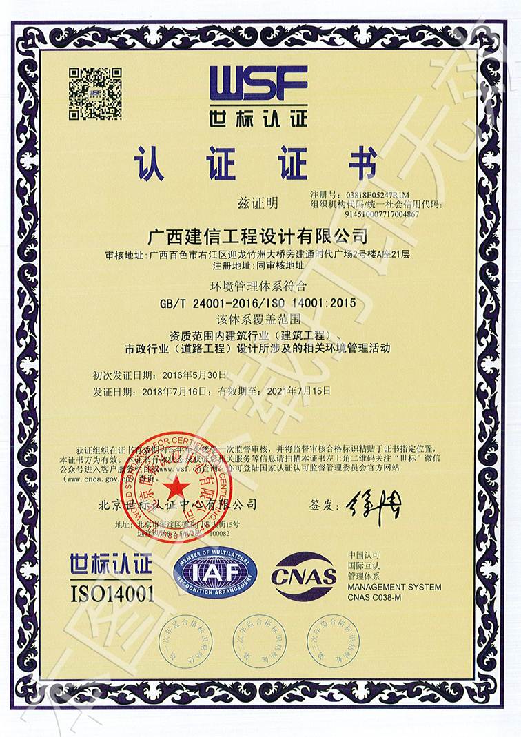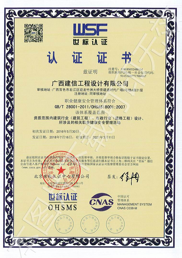 廣西建信工程設(shè)計(jì)有限公司三大管理體系認(rèn)證證書