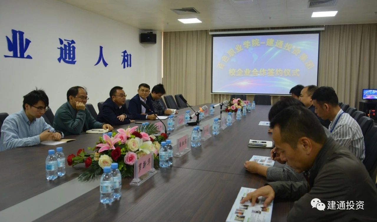 2019年4月2日上午10:30,百色職業(yè)學(xué)院-建通投資集團(tuán)校企業(yè)合作簽約儀式在我集團(tuán)百色總部“建通中心”2號(hào)樓A座2樓會(huì)務(wù)室順利召開,并成功簽約。出席此次簽約儀式的嘉賓有集團(tuán)副董事長(zhǎng)、總工程師謝乃鵬、集團(tuán)副董事長(zhǎng)黃樹威等集團(tuán)高層領(lǐng)導(dǎo)與百色職業(yè)學(xué)院黨委委員副院長(zhǎng)那家法、黨委宣傳部部長(zhǎng)楊昌和等5位校領(lǐng)導(dǎo)。校企雙方精誠(chéng)合作,攜手共進(jìn)。
