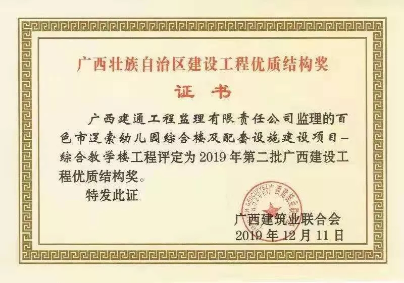 我集團(tuán)子公司承接的《百色市邏索幼兒園綜合樓及配套設(shè)施建設(shè)項(xiàng)目-綜合教學(xué)樓》項(xiàng)目被授予2019年第二批廣西壯族自治區(qū)建設(shè)工程優(yōu)質(zhì)結(jié)構(gòu)獎(jiǎng)稱號(hào)。