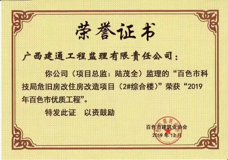我集團(tuán)子公司承接的《百色市科技局危舊房改住房改造項(xiàng)目(2#綜合樓)》項(xiàng)目榮獲了2019年百色市優(yōu)質(zhì)工程稱號(hào)。