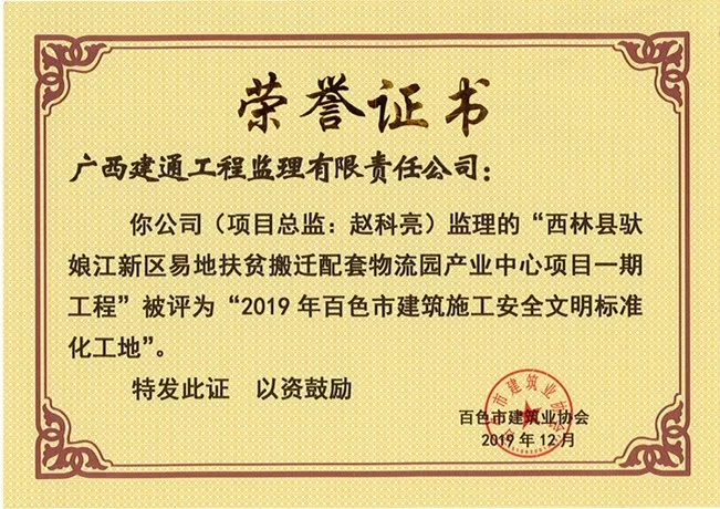 我集團(tuán)子公司監(jiān)理的《西林縣馱娘江新區(qū)易地扶貧搬遷配套物流園產(chǎn)業(yè)中心項(xiàng)目一期工程》項(xiàng)目榮獲2019年(第四批)百色市建筑施工安全文明標(biāo)準(zhǔn)化工地稱號(hào)。