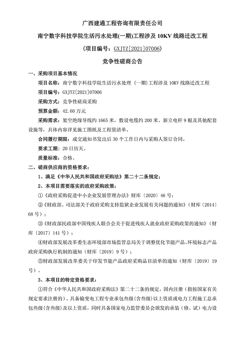 南寧數(shù)字科技學院生活污水處理(一期)工程涉及10KV 線路遷改工程 (項目編號:GXJTZ[2021]07006) 競爭性磋商公告