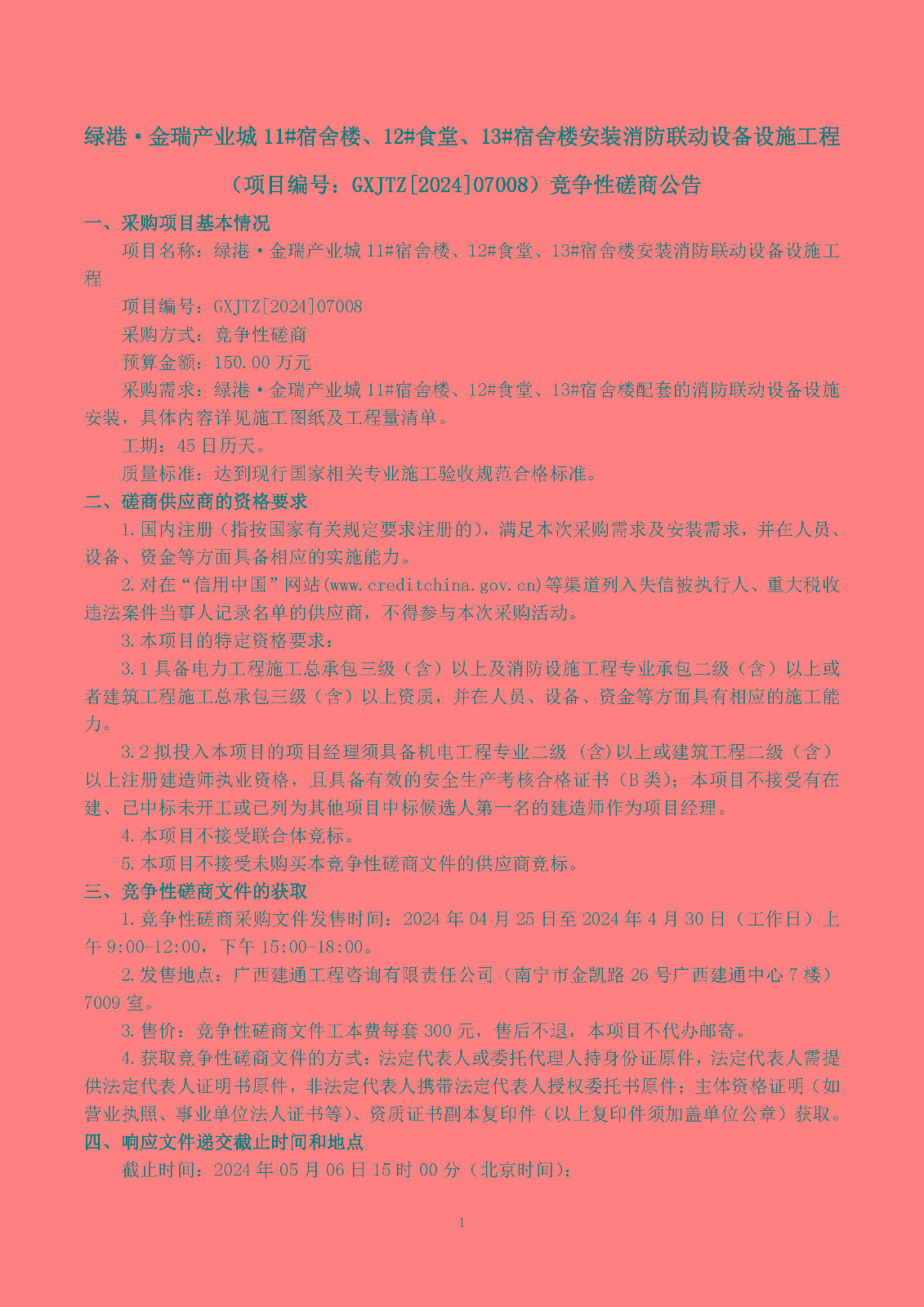 綠港·金瑞產(chǎn)業(yè)城11#宿舍樓、12#食堂、13#宿舍樓安裝消防聯(lián)動(dòng)設(shè)備設(shè)施工程 (項(xiàng)目編號(hào):GXJTZ[2024]07008)競(jìng)爭(zhēng)性磋商公告