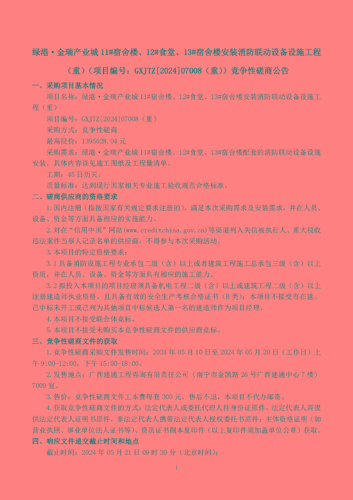 綠港·金瑞產(chǎn)業(yè)城11#宿舍樓、12#食堂、13#宿舍樓安裝消防聯(lián)動設(shè)備設(shè)施工程 (重)(項目編號:GXJTZ[2024]07008(重))競爭性磋商公告