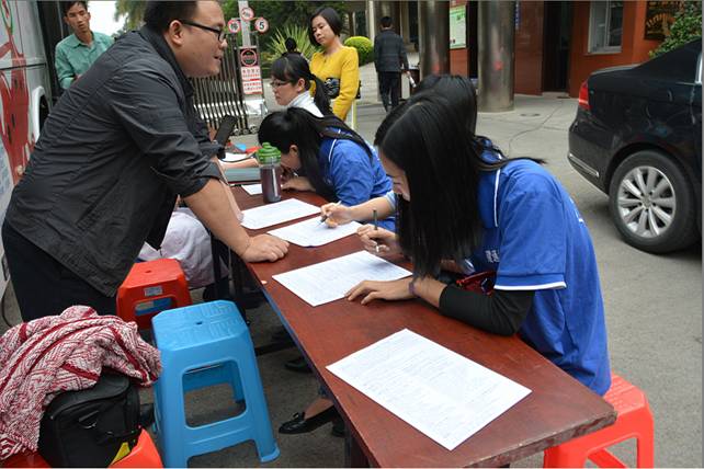集團(tuán)志愿者在認(rèn)真填寫個人信息表